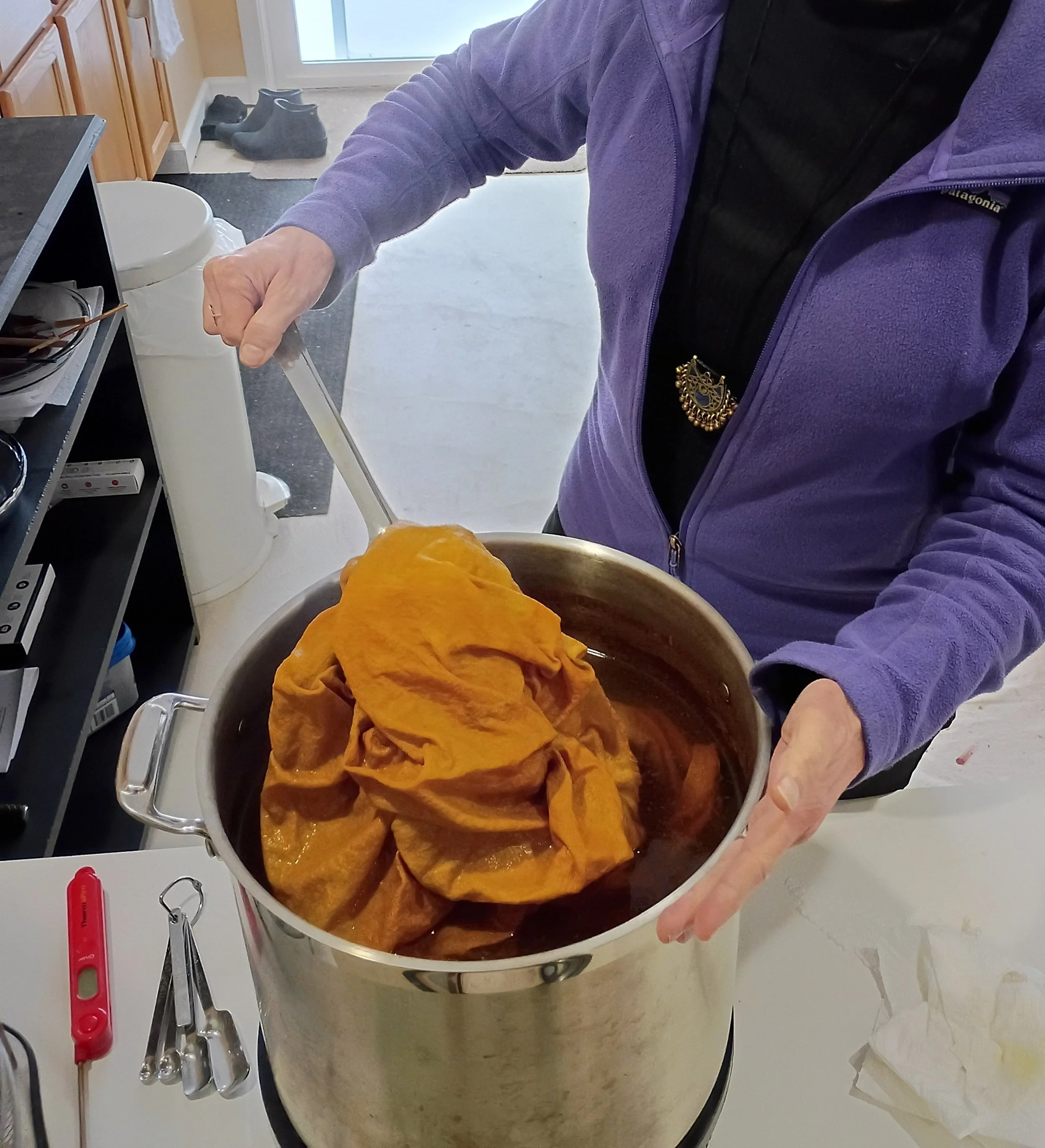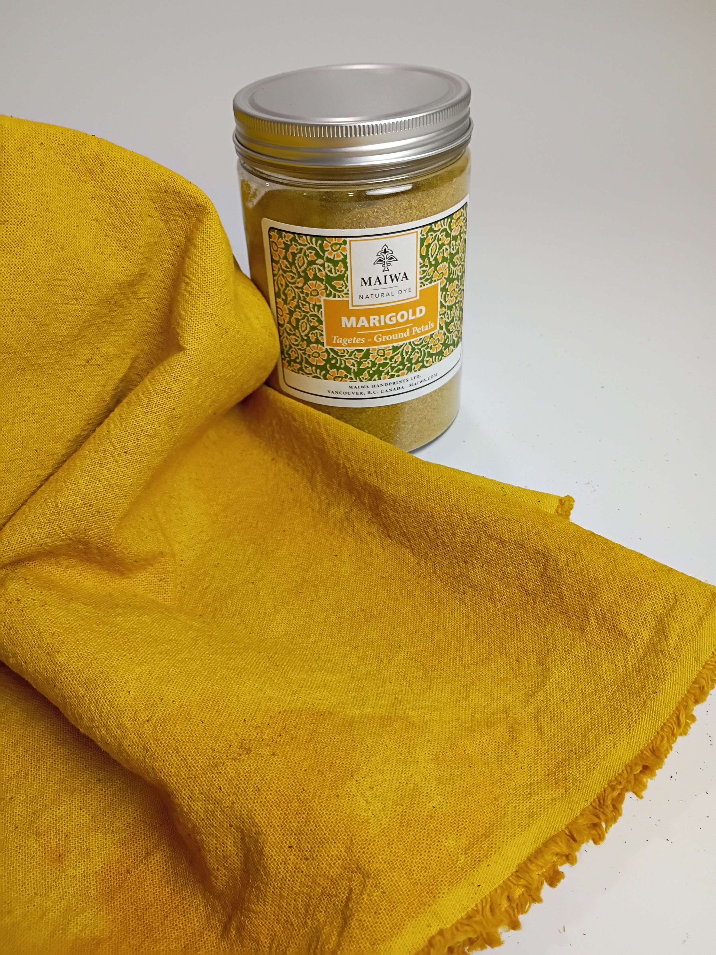 The plant extracts in my color palette create a beautiful range of desert browns and rose tones. The newest color I’m experimenting with is ground marigold flowers, and I’m thrilled with the results (shown here on a woven cotton muslin):